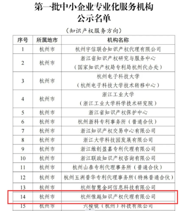 • 喜報!!關于杭州惟越知識產權代理有限公司入選浙江省首批中小企業(yè)專業(yè)化服務機構的公示